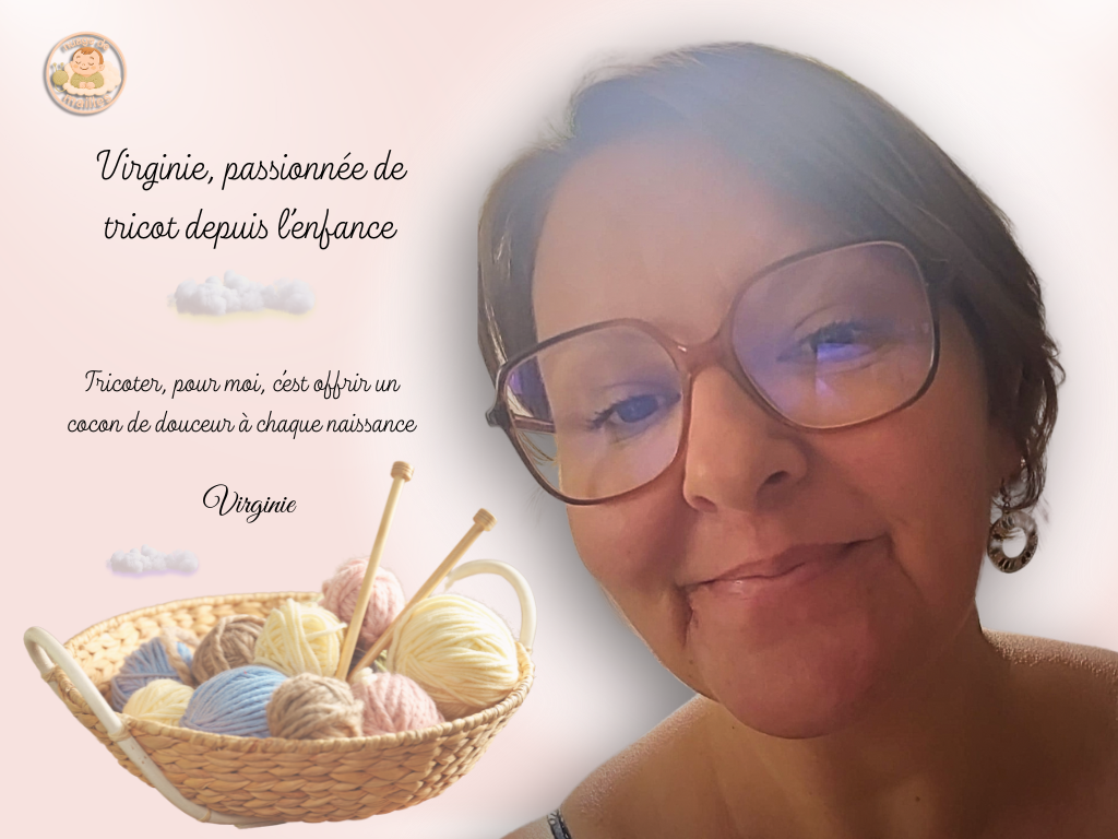 Je m’appelle Virginie, j’ai 46 ans, et je tricote depuis que j’ai 6 ans. C’est ma maman — aujourd’hui disparue — qui m’a appris les premiers gestes. Depuis, mes aiguilles m’accompagnent fidèlement, même si la vie m’avait un temps éloignée de cette passion.